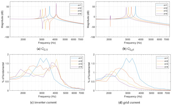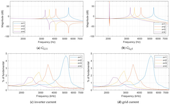 - The frequency response of is depicted in Figure 5d, which represents the grid current component of an inverter. Assuming identical inverters, this does not change the total grid current summed up for each inverter. Only one resonance peak can be identified. When the number of inverters increases, the resonant frequency decreases and the magnitude of the resonance peak is damped.
