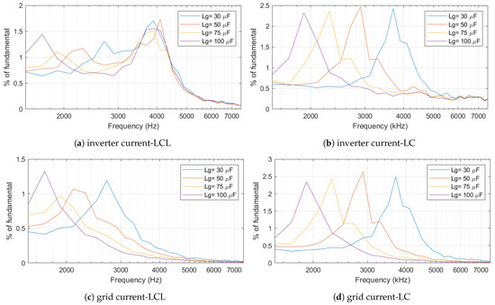 Resonant frequency characteristics variation against grid impedance: (a) inverter current with LCL filter; (b) grid current with LCL filter; (c) inverter current with LC filter; and (d) grid current with LC filter.