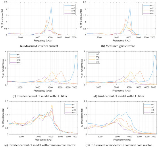 - The frequency spectrum of an individual inverter terminal current, tally with the frequency spectrum of the grid current (summation of each inverter current) according to Figure 6b,d.