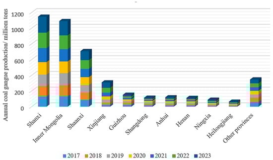 The annual coal gangue production in different provinces of China from 2017 to 2023 [5].