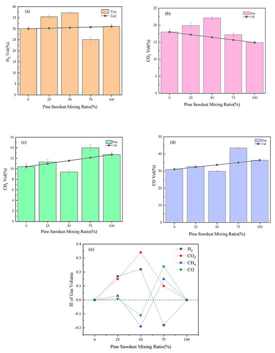 Effect of mixing ratio on gas composition of co-gasification. (a) The volume fraction of H2 as a percentage for different mixing ratios; (b) The volume fraction of CO2 as a percentage for different mixing ratios; (c) The volume fraction of CH4 as a percentage for different mixing ratios; (d) The volume fraction of CO as a percentage for different mixing ratios; (e) SI values for each gas at different mixing ratios [115].
