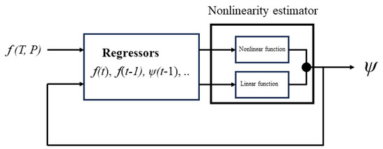Here, J, H, d, and K are the model parameters. The first and second terms in Equation (1) denote the outputs of the linear function and non-linear function blocks, respectively. M represents the projection or influence matrix to map the vector of response values to the vector of fitted values. The parameter d is a scalar offset. In case , the term represents affine. The block diagram of the non-linear ARX model is shown in Figure 1.