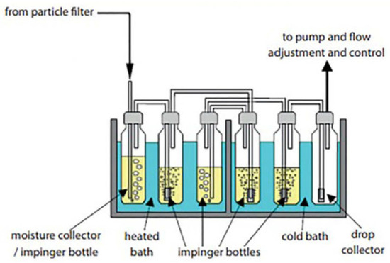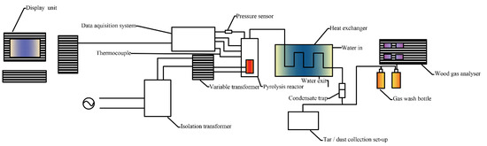The experimental task was performed at the premises of the Hungarian University of Agriculture and Life Sciences. The data collection was executed via a 16-channel data acquisition system. K-type thermocouples were used to measure the temperature at four different locations across the reactor. The pressure sensor was retrofitted with the lid to determine the dynamic pressure of the producer gas. Thermogravimetric change in the mass of material was based on a strain gauge measurement system. The sampling frequency for the measurement was 2 Hz. As an interface between the developed system and the transducer, the fifth version of the CATMAN module was considered. An orthographic sketch of the reactor is illustrated in Figure 2. The physical set-up of the unit is depicted in Figure 3. To tackle the heating range, a ceramic-based heating system was manually developed that can withstand more than 1000 °C without any dielectric breakdown. However, safety concern was also given priority and therefore an isolation transformer was provided to prevent the external circuit from failing. The voltage set-up to the heating filament was provided via a variable transformer so that a predetermined bed temperature could be met. The electricity measurement of the heating system was performed using the multifunction analyzer. The generated gas was measured through a portable wood gas analyzer equipped with gas wash bottles, a cotton wool filter, activated charcoal with a cotton wool filter, and a series of activated alumina soaked with potassium permanganate filters. To avoid condensation of tar, the gas was allowed to pass through a condensate trap before the gas analyzer. The sample collection rate was 700 mL per minute for the wood gas analyzer. To measure dust and tar content, 50 mL isopropanol was used. An illustrative diagram of the tar collection unit is shown in Figure 4 [36]. Before initializing the gas measurement, the volumetric rate was measured through a gas meter. The ultimate analysis of pine waste and char content is provided in Table 1 [37]. The information related to the equipment used is provided in Table 2.