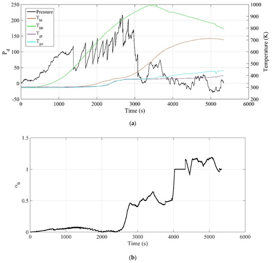 The change in the state properties of the system, temperature, and pressure with time is illustrated in Figure 5a. The variation in reacted mass fraction, αB, with time is shown in Figure 5b. A maximum pressure rise of 216.66 Pa was noticed at 20.30% of mass reacted during pyrolysis of PPN or at the onset of devolatilization. Similarly, the total pressure was dropped to 28.77 Pa during the char formation (αB = 1). During the inception stage of water evaporation, the system pressure rose by 434.42% with 0.31% of mass loss. The recorded pressure at the onset of devolatilization was 135 Pa, which was 14.12% higher than that noticed during evaporation. The overall fall in the pressure of the thermodynamic system till the completion of devolatilization was 66.88%, which was further curtailed to 9.5 Pa till the completion of pyrolysis of PPN. The standard deviation in the total pressure measurement across the reactor was ±55 Pa. The skewness in its distribution pattern about its average value of 55.07 Pa was 0.6. Similarly, the distribution of pressure across the reactor would exhibit the traits of the raised cosine function. The variability in the pressure fluctuation during the decomposition of PPN was seen to be low.