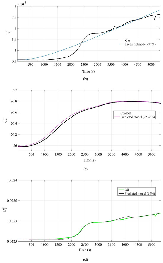 - The exergy cost model predominately followed the non-linearity in the form of the sigmoidal and wave network functions. The exergy cost associated with charcoal () reported by the proposed model was 20.37 ¢·s−1, an underprediction of the validation data by a margin of 23.38%. Similarly, the exergy cost rate to the pyrolysis oil was overpredicted by a percentage fraction of 13.63%. The overprediction in the change in the relative change in the cost of PPN (I) was 0.86%. Comparatively, the relative cost predicted by the ARX showed a good consensus with the validation for all the material streams. The lowest RMSE (6.32 × 10−6) was appended with the exergy cost model of the gas, whereas the maximum RMSE was seen in the model associated with charcoal production. In the same way, the best-fitted model with the validation data (I) was related to PPN and oil generation.