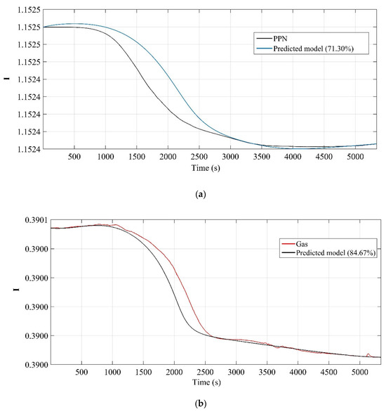 The ARX model was adopted to develop the exergy cost model for different material streams, which was fitted against the validation data in Figure 6a–e. Detailed information related to the different exergy costs is provided in Table 5 and Table 6. The comparison of validation data of the relative change in product and fuel cost (I) with predicted model flow is illustrated in Figure 7a–e.