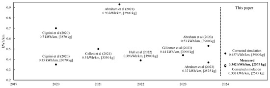 Energy expenditures from recent attempts in the literature compared to that measured in this paper [31,35,37,38,39,40]. Care should be taken when comparing these numbers, since different datasets and vehicles with different weights were used. The weights used for each source are reported.