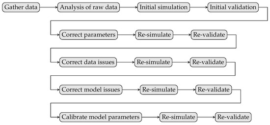 The process of this methodology is shown in Figure 2. Data are collected using a physical EV (in this case, the retrofitted electric minibus taxi). The obtained data are then analysed for various issues that may affect the simulation. In this step, extraneous data may be removed. With the raw data processed accordingly, the data are used to run an initial simulation, using EV-Fleet-Sim. With the first simulation completed, the simulation output is validated by comparing it to the results of the measured data. As further shown in Figure 2, this is followed by an iterative process of simulating and validating the results, which allows for making various corrections. These corrections are discussed further below.