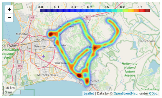 Vehicles routes over 30 trips conducted over 10 days with colour indicating density of samples.