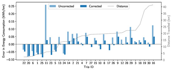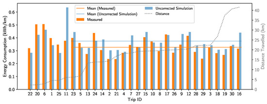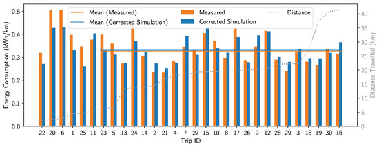 The final energy usage results are shown in Figure 10 after the changes described in Section 3.2 were implemented into the data and simulation model. The average energy usage reduced to 0.331 kWh/km for the longer trips (>5 km), which was significantly closer to the measured value of 0.327 kWh/km. This leads to an average error of 8.61%, with a standard deviation of 10.1%, which is substantially better than the initial error of 18.1% and standard deviation of 18.3%.