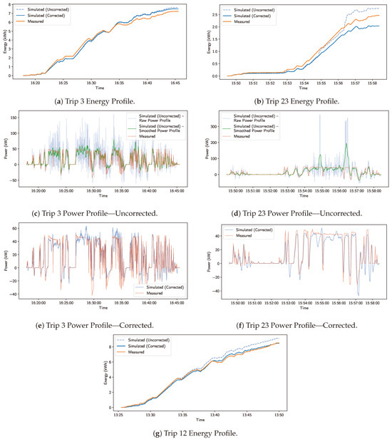 For the trips that exceed 5 km, Trip 12 exhibited the smallest absolute error, whereas Trip 23 had the largest error. Consequently, these two trips were selected for detailed comparative analysis in subsequent plots. Notably, Trip 23 is an intra-town journey within Somerset West, whereas Trip 12 spans from Somerset West to Stellenbosch (18.8 km). With these extremes, Trip 3 is also shown as a typical trip in Figure 6. The energy profile of Trip 23, for example, shows that the simulated energy (before corrections, indicated by the dashed line) overshoots the measured energy shortly after time 15:56. In Trip 3, the energy is initially underestimated, but from around 16:35, it is overestimated.