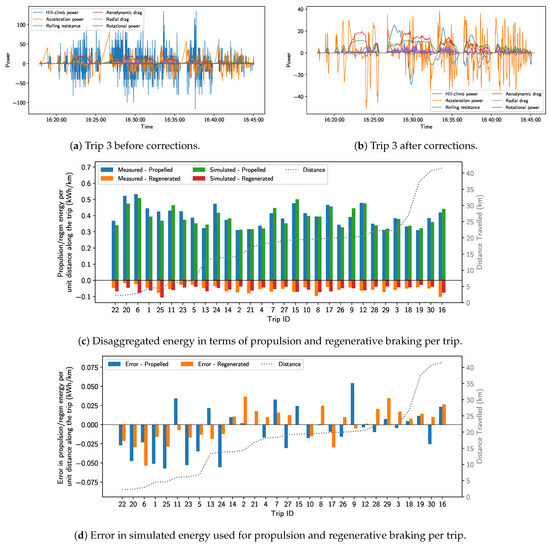 Disaggregation of power components. Trip 3 (a,b) shows the disaggreated output for all the components. The simulation before corrections were applied is shown in (a,b) shows the output from the corrected simulation. Propulsion and regeneration energy components per trip after corrections are shown in (c), and the remaining errors are shown in (d).