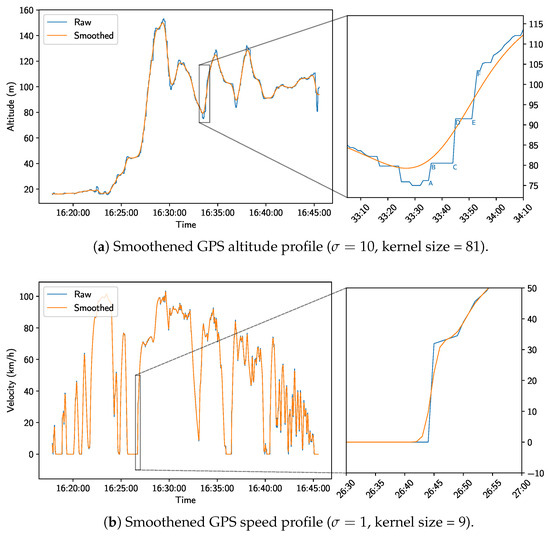 After making this parameter update, the scenario was simulated and the results compared/validated against the measured values. This revealed noisy power profiles, as discussed in Section 3.2. The cause of this was a consequence of three data issues. The first two issues were the presence of high-frequency components in the elevation and speed profiles. Therefore, the first two corrections were to apply Gaussian smoothing to the elevation and speed profiles. Details about this issue and the effect of the two corrections are described in Section 3.2.1 and Section 3.2.2.