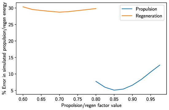 Having implemented these corrections, the propulsion and regeneration factors were tuned to match the measured values by running the simulation models with many combinations of propulsion and regeneration factors. It was found that the factors were mutually exclusive in their effect. In other words, a change in propulsion factor did not have any change in the regeneration energy error and vice versa. The error in the propulsion/regeneration energy calculation for various propulsion/regeneration factors is shown in Figure 9. This figure shows that the optimum propulsion and regeneration factors are 0.9 and 0.65, respectively. However, these are the same values used in the original simulation (as determined in Abraham et al. [40]).