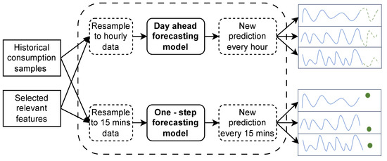 This section aims to describe the process of designing the forecasting models for each consumer type, once they are classified; the reasoning behind model selection, parameter selection, and training process is also discussed. In Figure 2 the diagram of the proposed algorithm architecture is shown, where it can be seen that, based on historical consumption data and the most relevant features, further detailed in Section 3.2.1, and after being resampled adequately, each forecasting algorithm needs to perform two distinct forecasting tasks: one is a one-step forecast 15 min ahead in the future, and the other performs a prediction of the next 24 h at each time step of the testing data, i.e., hourly.