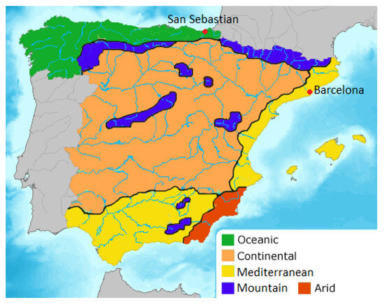 The available dataset comprises 15 min interval data for two years of power consumption for real-use cases located in Spain, of four industrial and two commercial consumers, data provided by an SME specialized in global electrical solutions, control, electrical maintenance, and data analysis. Moreover, a DSO also provided data for five residential consumers. Spain has different climate zones, as depicted in Figure 3, and as we are going to take weather-related variables into account, it is important to know the location of each customer. In our case, specifically, the industrial and commercial consumers are situated in the Basque Country, near San Sebastian, on the coast of the Bay of Biscay, dominated by a warm, humid, and wet oceanic climate. On the other hand, the residential consumers are located in Catalonia, near Barcelona, in the northeast of Spain, with a Mediterranean climate, Figure 3. Despite climate differences, these two regions have similar GDPs and socio-economic characteristics.