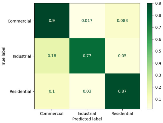 Results from the rule-based classification algorithm are shown in the confusion matrix of Figure 4. There is a significant imbalance in the number of available datasets for each category, which poses a challenge for conducting comprehensive analyses. To address this issue, we have divided the underrepresented datasets into more subsets (6 subsets in the case of residential datasets, and 30 in industrial and commercial datasets) to ensure a balanced representation across different categories. This approach allows for a more equitable distribution of data, enhancing the robustness of the analysis while reducing potential biases caused by the overrepresentation of certain dataset types. By doing so, we aim to provide a more thorough and accurate evaluation that accounts for the inherent data discrepancies. The algorithm performs correctly in overall 85% of the cases. The industrial datasets are classified correctly 77% of the time, accuracy in residential datasets is 87%, and accuracy in commercials is 89%. These values comply with the established KPIs, which state that the classification algorithm must cluster consumers (residential, commercial, industrial) with a precision of >75%.