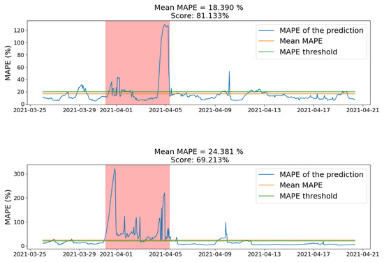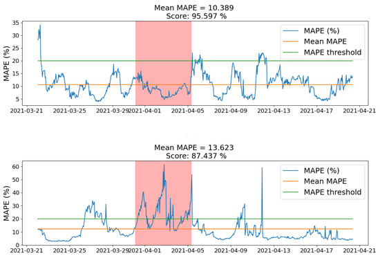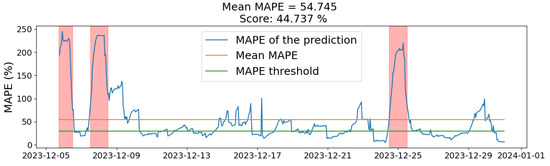 Accuracy measures how closely forecasted values match actual values, typically expressed as a percentage. MAPE, which is scale-independent and interpretable as a percentage, is useful for comparing forecasts across datasets, while MAE provides error in the same units as the data and is robust to outliers. Optimizing MAPE can lead to demand underestimation, whereas optimizing MAE aims to balance errors, which can be problematic with extreme load variations such as in industrial consumers. Low load values can challenge MAE and MAPE evaluation, as occurs with residential consumers [49]. To address instances of significant error despite low average metrics, we use a quantitative score to measure the frequency of MAPE and MAE falling below a set threshold, highlighting periods of model underperformance potentially due to unaccounted seasonality or complex factors.