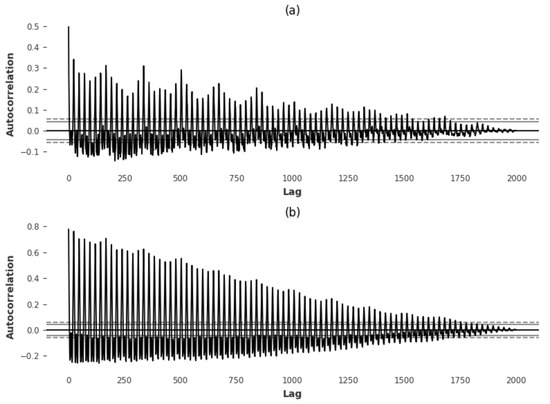 Thus, the datasets are in general irregular, with peaks at given hours. Some of the peaks are very periodic and are produced at the same hour every day, but other peaks vary more in time and are more difficult to predict. This fact is described by the weekly and daily autocorrelation plots in Figure 12. In some municipalities, peaks are more regular and, therefore, the autocorrelation is considerable, but in other municipalities, autocorrelation is lower, resulting in irregularities in its demand peaks. That is why here again, it is not sufficient to apply a single model directly.