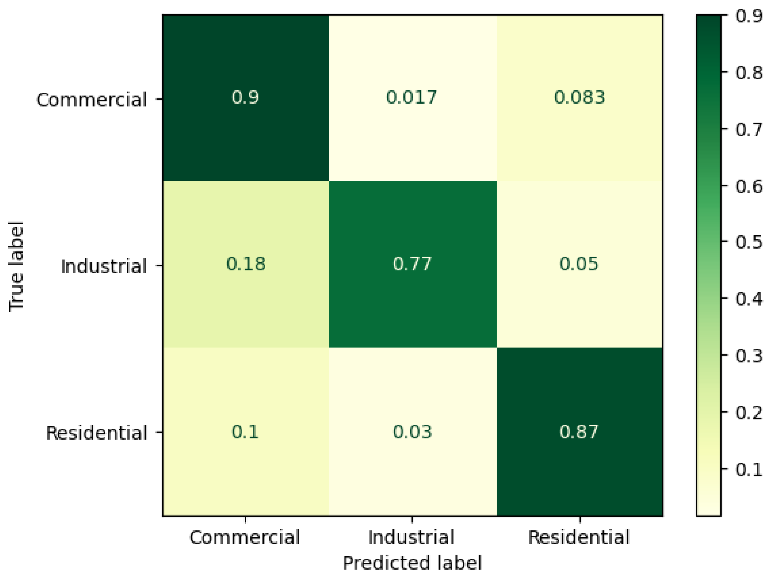 commercial if the standard deviation of mean consumption at different hours exceeds 0.1, and if mean consumption on holidays is lower than on workdays. The first condition identifies commercial datasets, which have consistent consumption peaks at specific hours, leading to a higher standard deviation compared to the more irregular residential consumption patterns. The second condition prevents misclassification of residential data that fits the first condition. Additionally, if mean consumption on Saturdays is more than 1.5 times that on Sundays, the dataset is also classified as