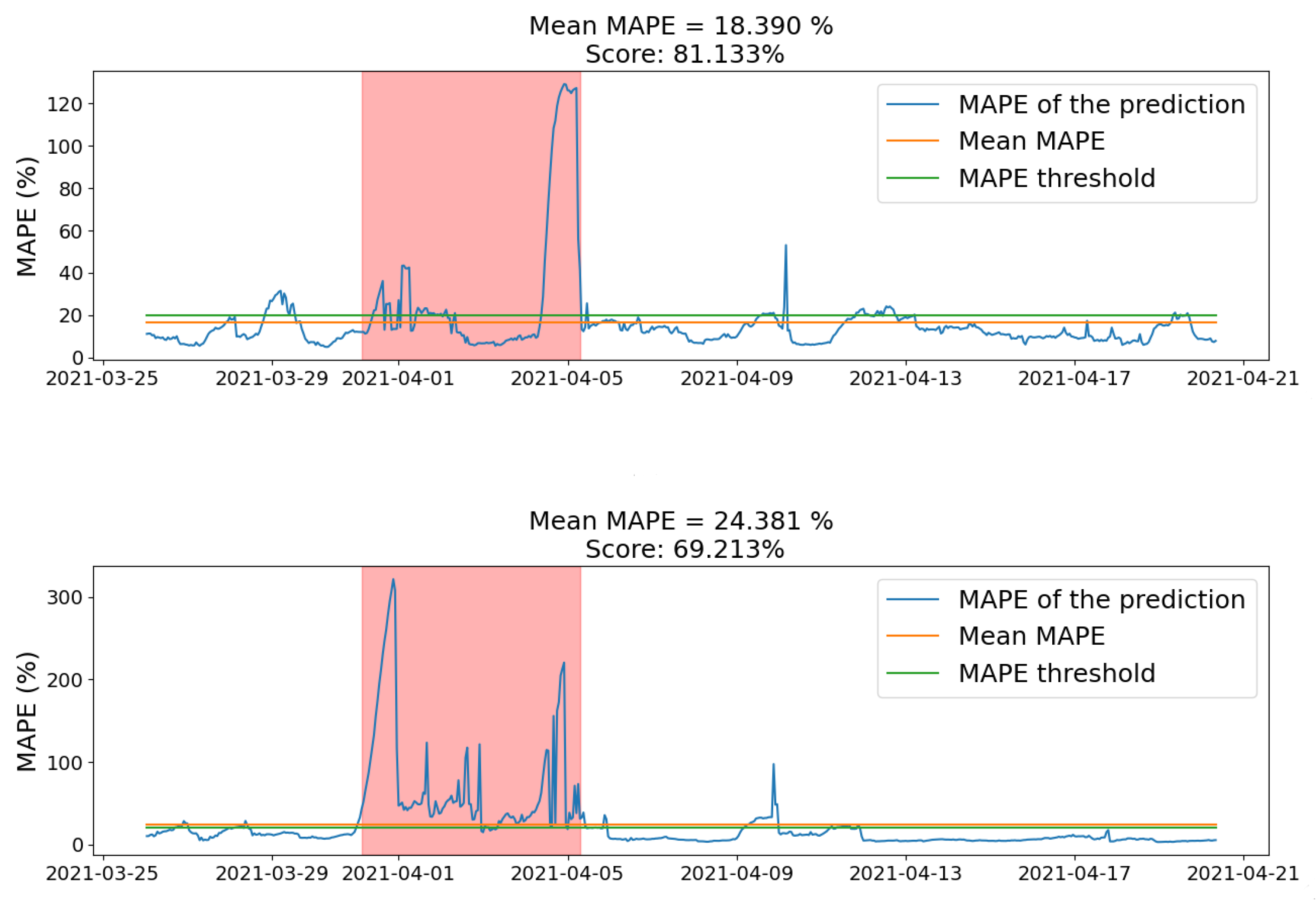 Figure 8, it can be seen that it underperforms when the dates correspond to holidays: the marked area relates to the Easter holidays of 2021.