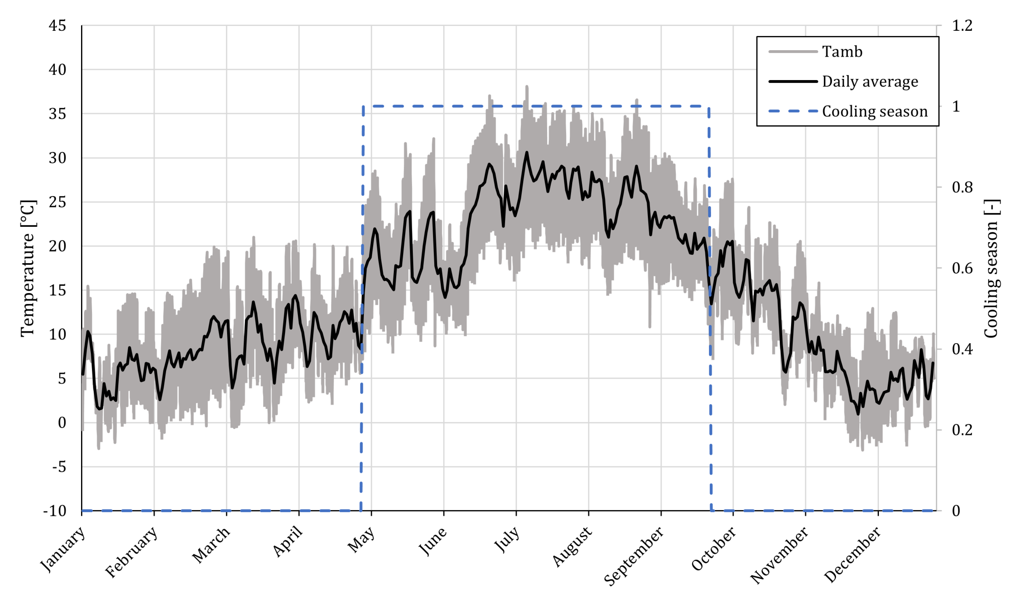 - For Madrid, a “cooling season” (warm months where cooling demand peaks and heating demand tends to be domestic hot water production alone) is defined. This has been chosen by looking at the temperature profile from the climate data obtained from Figure 4. And assuming that cooling production occurs between dates that the daily average ambient temperature of the three last consecutive days remains above 15 °C and is turned off when this condition is not fulfilled two days in a row (4 May to 29 September).