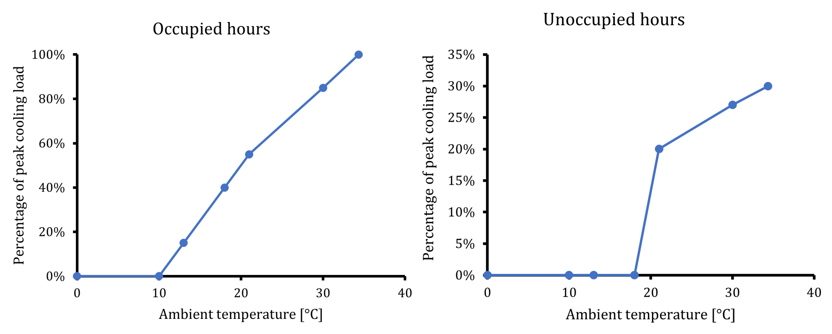 - The dimensionless hourly cooling load is estimated based on conversion tables (one for hours with occupation, the other for hours with no occupation) relating the ambient temperature with the fraction of peak cooling load, as shown in Figure 5. The peak cooling load (100%) is assigned to the highest hourly ambient temperature. Hourly dimensionless cooling demand profile is developed for Madrid following Equation (1).