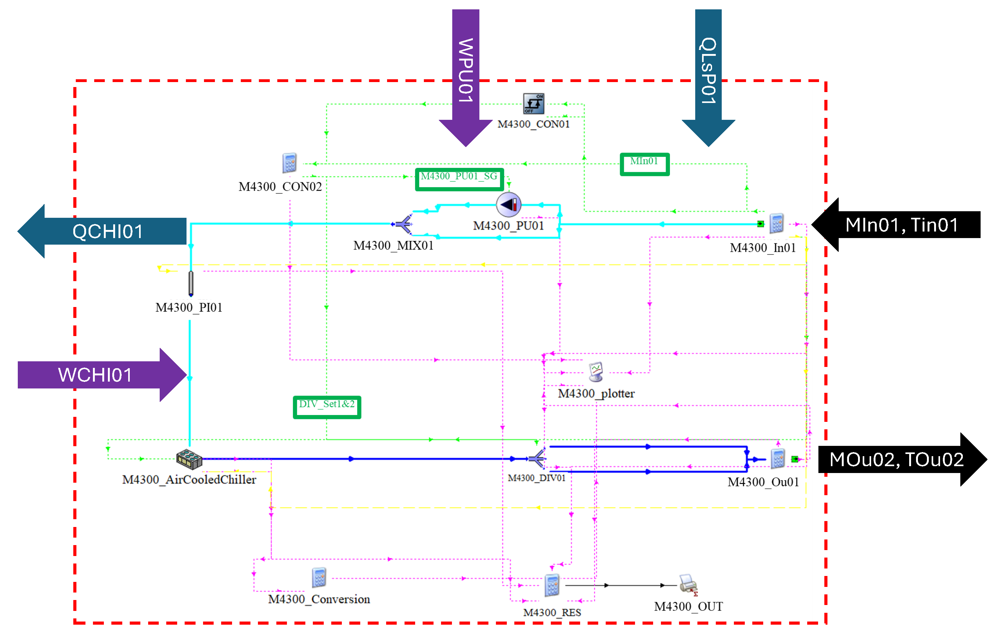 - Variables used for input and output are exchanged between different macros via equation blocks. This method streamlines the process, minimizes the number of connections, and facilitates the efficient replacement of one macro with another, requiring changes to only a few connectors.