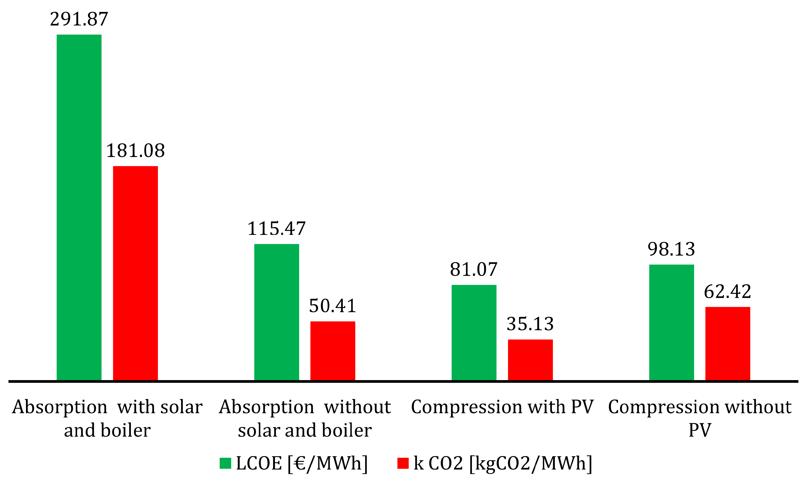 - Under different sizing considerations. Measuring the impact of photovoltaic panels and in the case of absorption chillers, how much impact has the possibility of having a usable surplus of energy to supply the heating needs of the equipment.