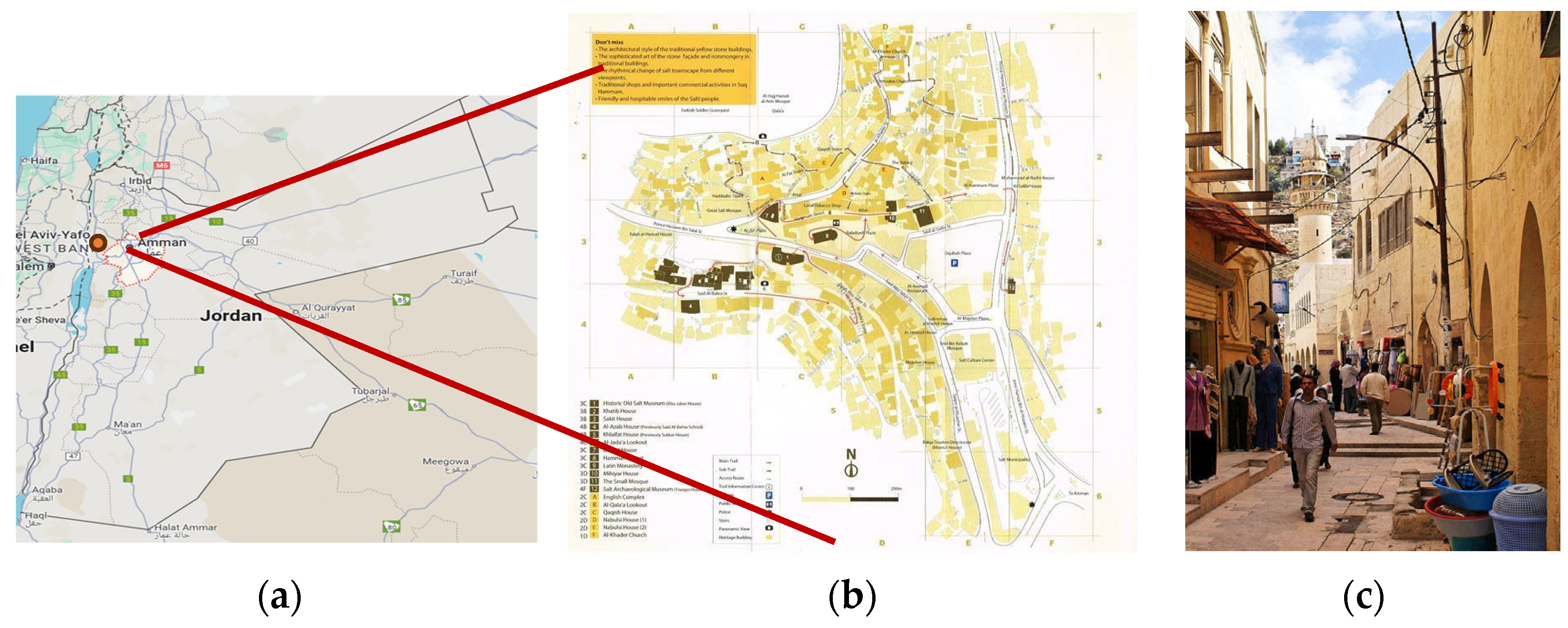- Al-Zoabi, A.Y. The residents’ ‘images of the past’ in the architecture of Salt City, Jordan. Habitat Int. 2004, 28, 541–565. [Google Scholar] [CrossRef]