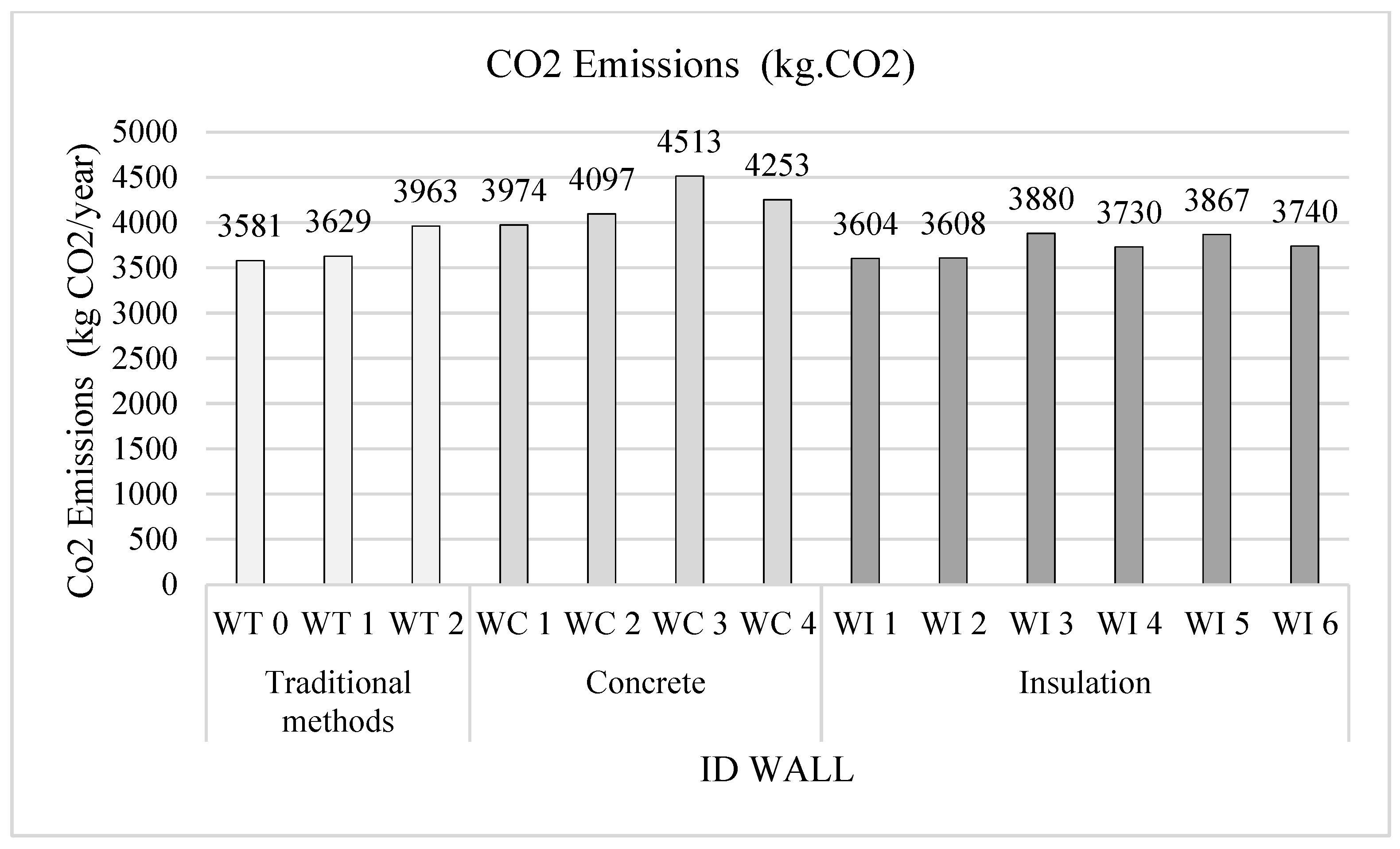 Concrete walls (WC1 to WC4): the concrete walls, especially those without insulation, had high building energy demand and CO2 emissions. The conclusion of the findings is in line with preceding literature, highlighting the importance of insulation on energy-efficient systems of concrete walls. Uninsulated concrete walling minimizes thermal efficiency, thus necessitating the deployment of more energy during heating and cooling.