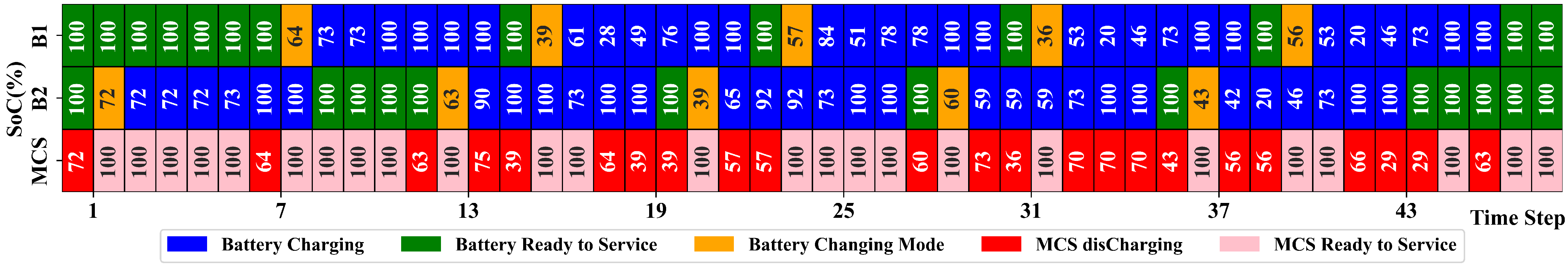 - Action 3: The agent refers to one of the batteries to replace the battery ().If the battery is not ready for replacement or the energy stored in the MCS is equal to the maximum possible energy, the agent will be fined. If the battery has announced its readiness for replacement (battery readiness has been sent to the control center one time step earlier) and the MCS energy is lower than the maximum MCS value, in this case, the agent will receive a reward due to the correct action.