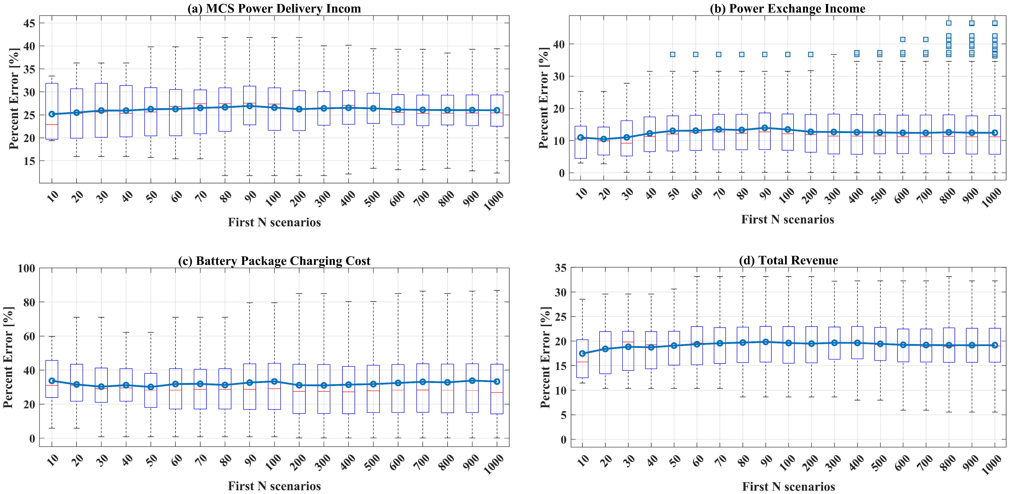 - Case 2: Scheduling of MCS services and charging of associated batteries, without considering the technical constraints of the power grid.
