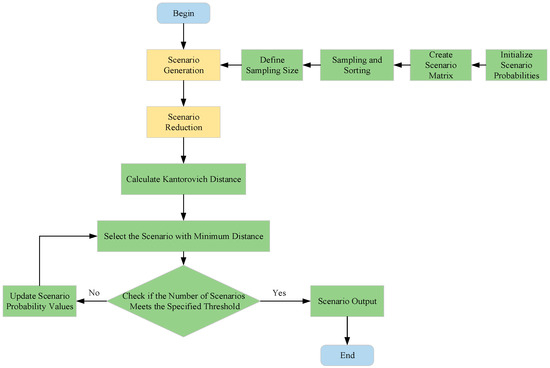 The power output of wind and photovoltaic (PV) systems is characterized by uncertainty and volatility [23,24]. Due to the limited accuracy of existing forecasting models, achieving high-precision prediction remains challenging [25]. Directly incorporating such uncertain outputs into optimization models often leads to computational difficulties or unreasonable results. Therefore, it is necessary to transform the uncertainties into deterministic representations. When the probability distributions of wind and PV outputs are available, the scenario analysis method can be employed [26,27], which is a type of stochastic optimization [28]. This method generates a set of representative scenarios with associated probabilities, thereby converting the problem into a deterministic one. Scenario analysis consists of two stages: scenario generation and scenario reduction [29]. In this study, the Latin Hypercube Sampling (LHS) method [30] is applied to generate a large number of wind and PV output scenarios, and the Scenario-Based Reduction (SBR) algorithm based on Kantorovich distance [31] is used for scenario reduction. The resulting typical scenario sets and their probabilities are then obtained. The detailed process is illustrated in Figure 1.