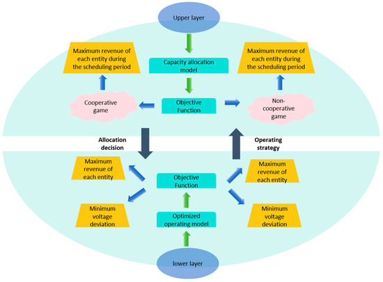 - A bi-level optimization model considering the interaction between capacity allocation and operation scheduling is developed, enabling dynamic parameter interaction between the two levels. The upper-level focuses on the capacity configuration of different generation entities to determine the optimal capacity mix, while the lower-level addresses multi-objective operation scheduling, balancing conflicting objectives such as “profitability–stability” under operational constraints. Through the deep integration of long-term and short-term decision-making, the model enhances system economy and energy utilization efficiency.