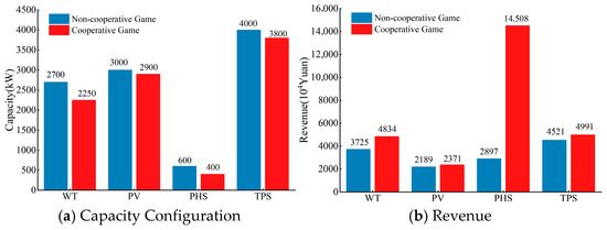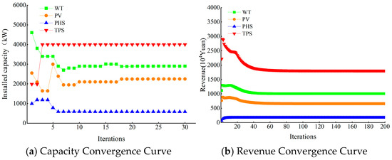 In the formula, , , , and are the revenues of wind power, photovoltaic power, pumped-storage, and thermal power in the non-cooperative game, respectively. and are the optimal capacity strategies of wind power, photovoltaic power, pumped-storage, and thermal power, respectively. is the capacity set that maximizes the objective function.