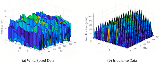 In the formula, , , and are, respectively, the minimum capacity limits of the system’s wind power, photovoltaic power, and pumped-storage power stations; , , and are, respectively, the rated capacities of a single wind power, photovoltaic power, or pumped-storage power station; , , and are, respectively, the quantities of installed wind power, photovoltaic power, and pumped-storage units; , , and are, respectively, the maximum capacity limits of the system’s wind power, photovoltaic power, and pumped-storage power stations.