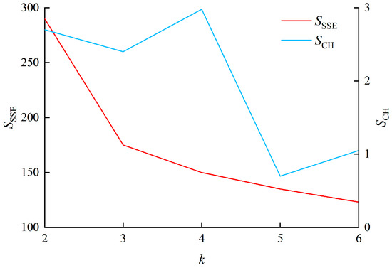 The choice of cluster count is crucial for optimal results. A high number yields precise but complex clusters, whereas a low number risks errors, underscoring the importance of prudent center selection. The optimal number of clusters is determined based on effective indicators of the clustering algorithm. A combination of the sum of squared errors (SSEs) in clusters, used in the elbow method, and Calinski–Harabasz (CH) index [32] is employed to calculate the sum of the squared errors of each sample relative to its cluster center [33,34] The expression for the SSE indicator () is as follows: