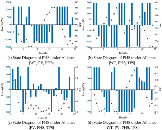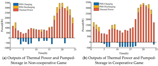 The power outputs of thermal power and pumped-storage hydropower under non-cooperative and cooperative game modes are shown in Figure 14. When analyzing the volatility of thermal power, it was found that the volatility is relatively low under the non-cooperative game mode. This phenomenon is mainly attributed to the fact that, in the cooperative game mode, to maximize the overall benefits, not only pumped-storage hydropower stations but also thermal power plants participate in regulating the volatility of wind and photovoltaic power. This is because participants in the cooperative game work together to address the fluctuations of the overall system, thereby achieving overall optimization. In contrast, in the non-cooperative game mode, each participant primarily focuses on maximizing their own interests. When faced with output fluctuations beyond their individual regulation capabilities, they usually do not actively engage in additional regulation activities.