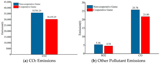 - Comparing the cooperative and non-cooperative game modes in the combined power generation system, the benefits per unit capacity of wind power, photovoltaic power, pumped-storage hydropower stations, and thermal power under the cooperative game mode are CNY 0.111 million/kW, CNY 0.018 million/kW, CNY 1.161 million/kW, and CNY 0.047 million/kW higher than those under the non-cooperative game mode, respectively. Additionally, the renewable energy utilization rate increases by 4.33%. In terms of pollutant emissions, CO2 emissions decrease by 5505.95 tons, SO2 emissions by 0.82 tons, and CO emissions by 3.98 tons. In terms of system stability, the total system voltage deviation is reduced by 5.51.