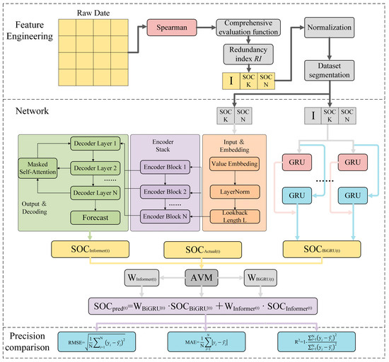 To overcome these limitations, it is crucial to develop effective feature engineering strategies. Not only is minimizing data redundancy critical, but preserving the most informative signals related to SOC dynamics is also critical. Methods such as correlation analysis, redundancy minimization, and nonlinear feature selection can promote the elimination of irrelevant variables. It is necessary to strengthen the model’s ability to capture the relationship between the SOC of cells and the SOC of the battery pack. By considering time-related interactions, degradation trends, and actual operating conditions, combining time information from battery cells can enhance the characterization of battery pack status. In summary, the main contributions of this study are as follows: