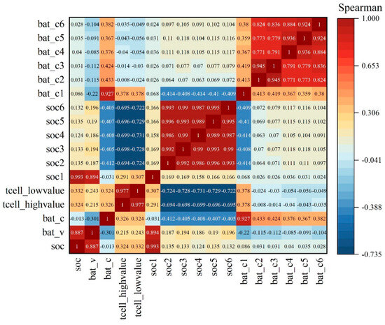 The SOC of a battery pack is determined not only by overall system-level information, but also by the interactions between individual cells within the pack. Therefore, system-level characteristics and information from individual cells must be used as model inputs when predicting the SOC of a battery pack. This integrated approach provides a more accurate and comprehensive characterization of the SOC dynamics within the battery pack. As the amount of input information increases, the model can obtain more relevant data, enabling a more comprehensive and accurate assessment of the SOC of the battery pack. However, increasing the amount of input data also introduces redundancy, which leads to unnecessary consumption of computational resources. In addition, including information that is irrelevant or minimally relevant to battery pack SOC predictions increases model complexity and imposes an additional computational burden. In order to mitigate the risk of increased computational complexity and model overfitting due to redundant feature variables, a redundancy control method based on Spearman’s correlation coefficient is introduced in this study for screening of features related to SOC estimation of battery packs.