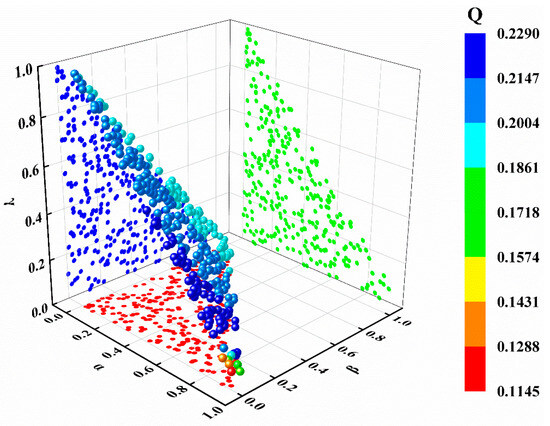 To simultaneously enhance estimation accuracy, feature set compactness, and computational efficiency in the battery SOC modeling process, we employed global sensitivity analysis. This framework quantifies the relative influence of candidate inputs on model outputs, thereby guiding the construction of minimal feature sets while limiting computational costs. We drew weight coefficients (α, β, γ) from a Dirichlet distribution over a 3-simplex to systematically generate 300 normalized combinations (where α + β + γ = 1). The comprehensive Q-value corresponding to each combination was calculated, and the optimal RI was selected at different redundancy levels.