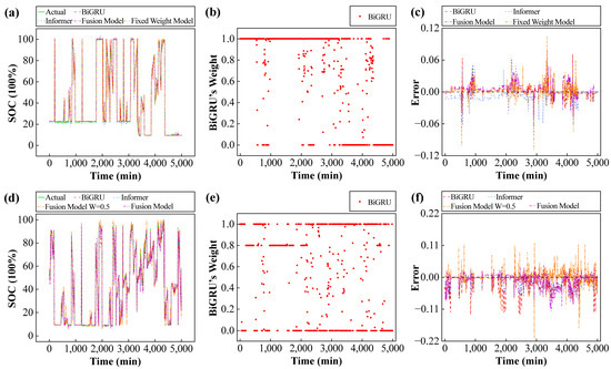 Estimation results and error with fixed-weight model, fusion model, BiGRU, and Informer: (a,d) SOC estimation result of third and fourth quarter; (b,e) BiGRU’s Weight Distribution Over Time; (c,f) SOC estimation error of third and fourth quarter.