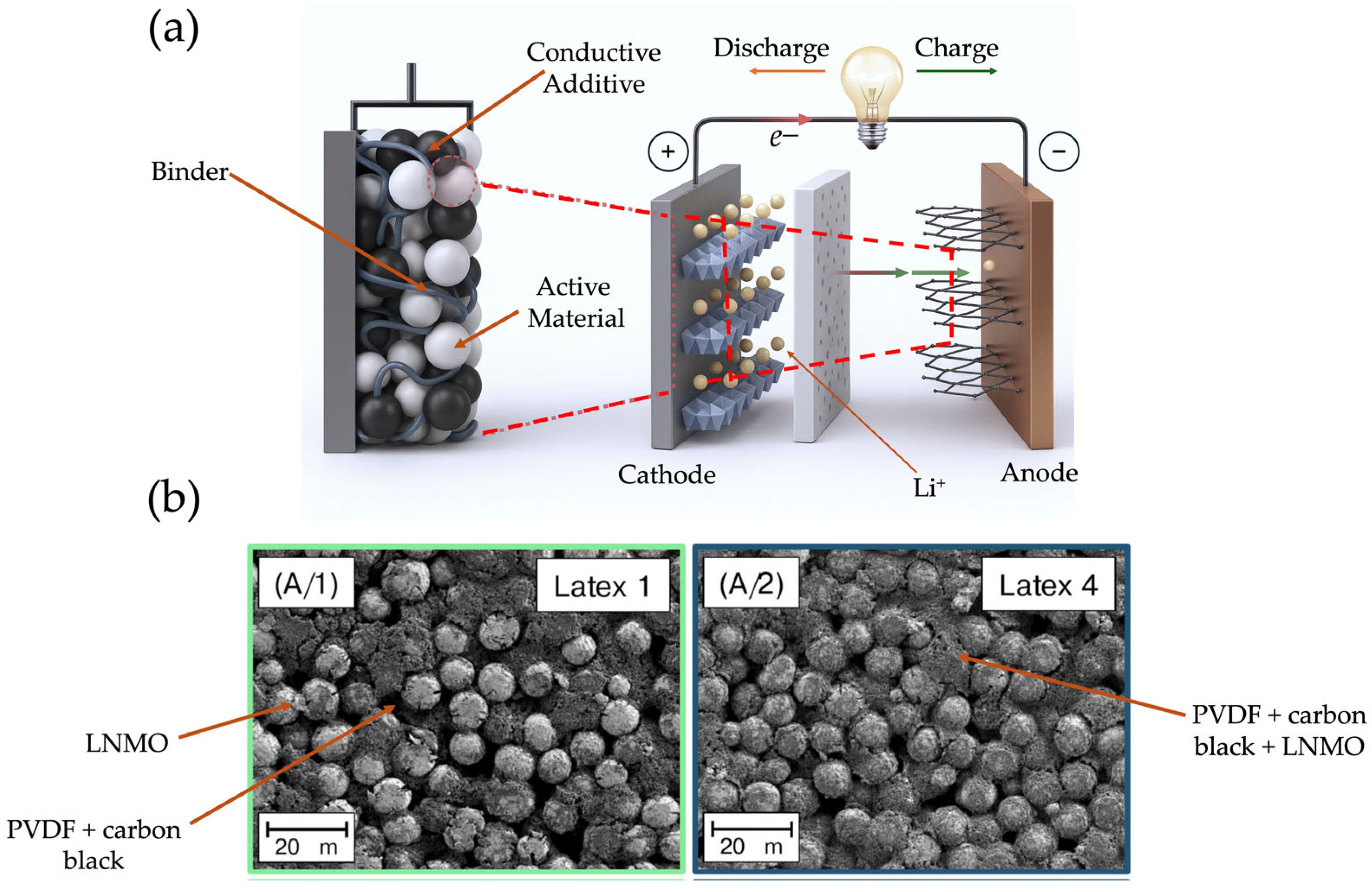 - Weber, A.; Keim, N.; Koch, P.; Müller, M.; Bauer, W.; Ehrenberg, H. The Impact of Binder Polarity on the Properties of Aqueously Processed Positive and Negative Electrodes for Lithium-Ion Batteries. Sci. Rep. 2025, 15, 10024. [Google Scholar] [CrossRef] [PubMed]