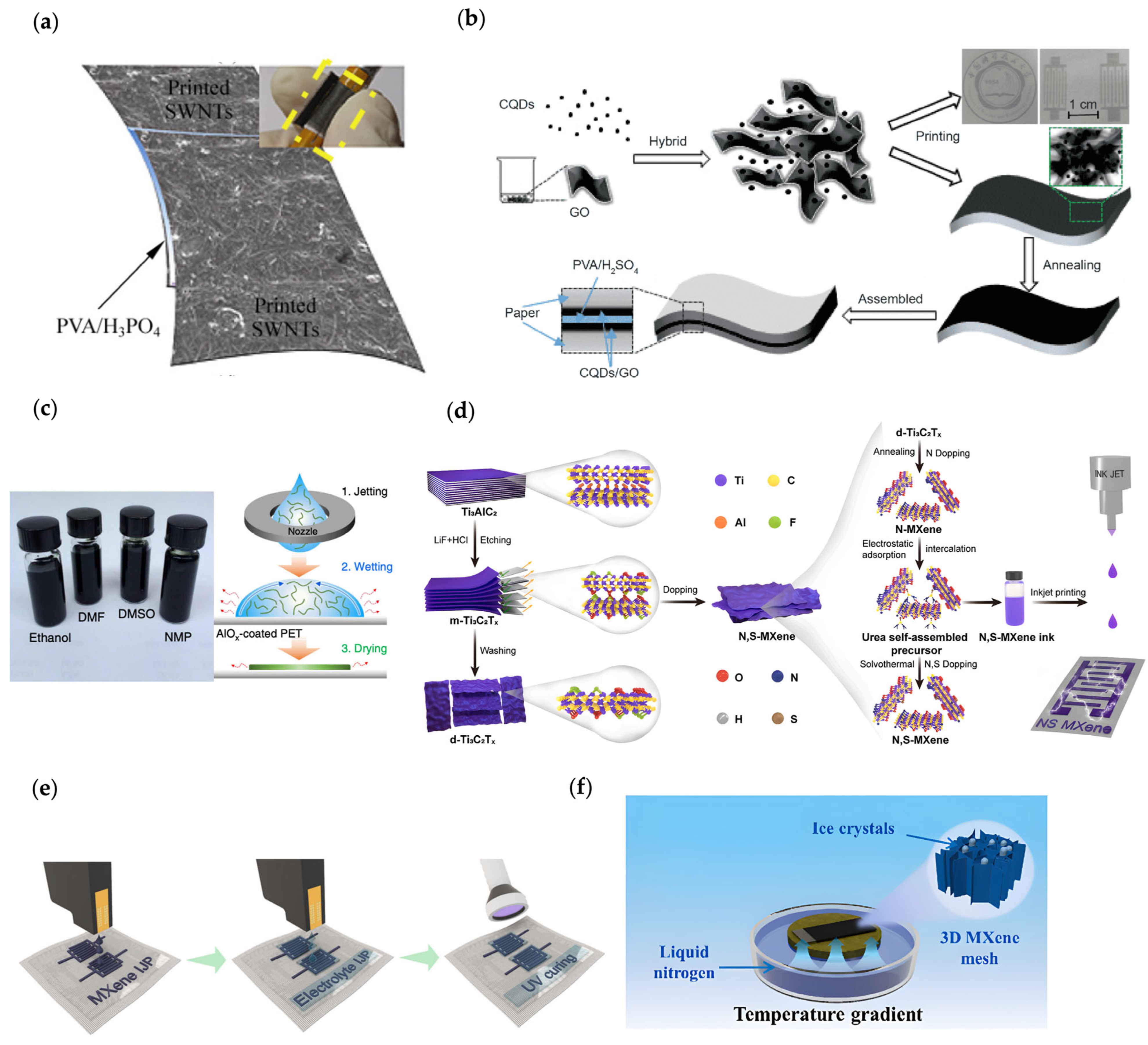 All-MXene micro-supercapacitor [31] | Aqueous: water; Organic: NMP, DMSO, DMF, ethanol | None | NMP: ~2.2 Pa·s, ethanol: ~2.6 Pa·s, aqueous: 0.71 Pa·s | Dimatix DMP-2800 (FUJIFILM Dimatix, Santa Clara, CA, USA), Voxel8 (extrusion), ambient | AlOx-coated PET, paper | None | Volumetric capacitance 562 F cm−3; ~100% retention after 10,000 cycles; Energy density 0.32 µWh cm−2 at 11.4 µW cm−2 |
