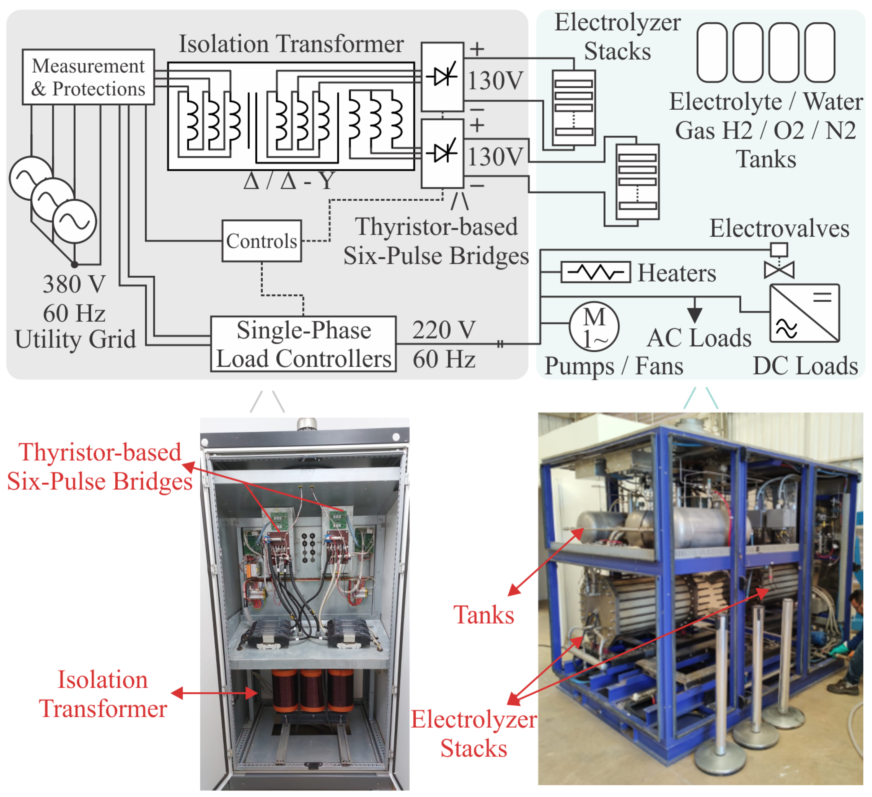 20]. The power supply of commercial electrolyzers is usually based on Alternating-Current (AC) systems, employing rectifiers (AC/DC converters) to integrate DC electrolyzers into the electrical utility AC grid, with most of them mainly based on transformers associated with thyristor rectifiers or transistor and diode rectifiers [