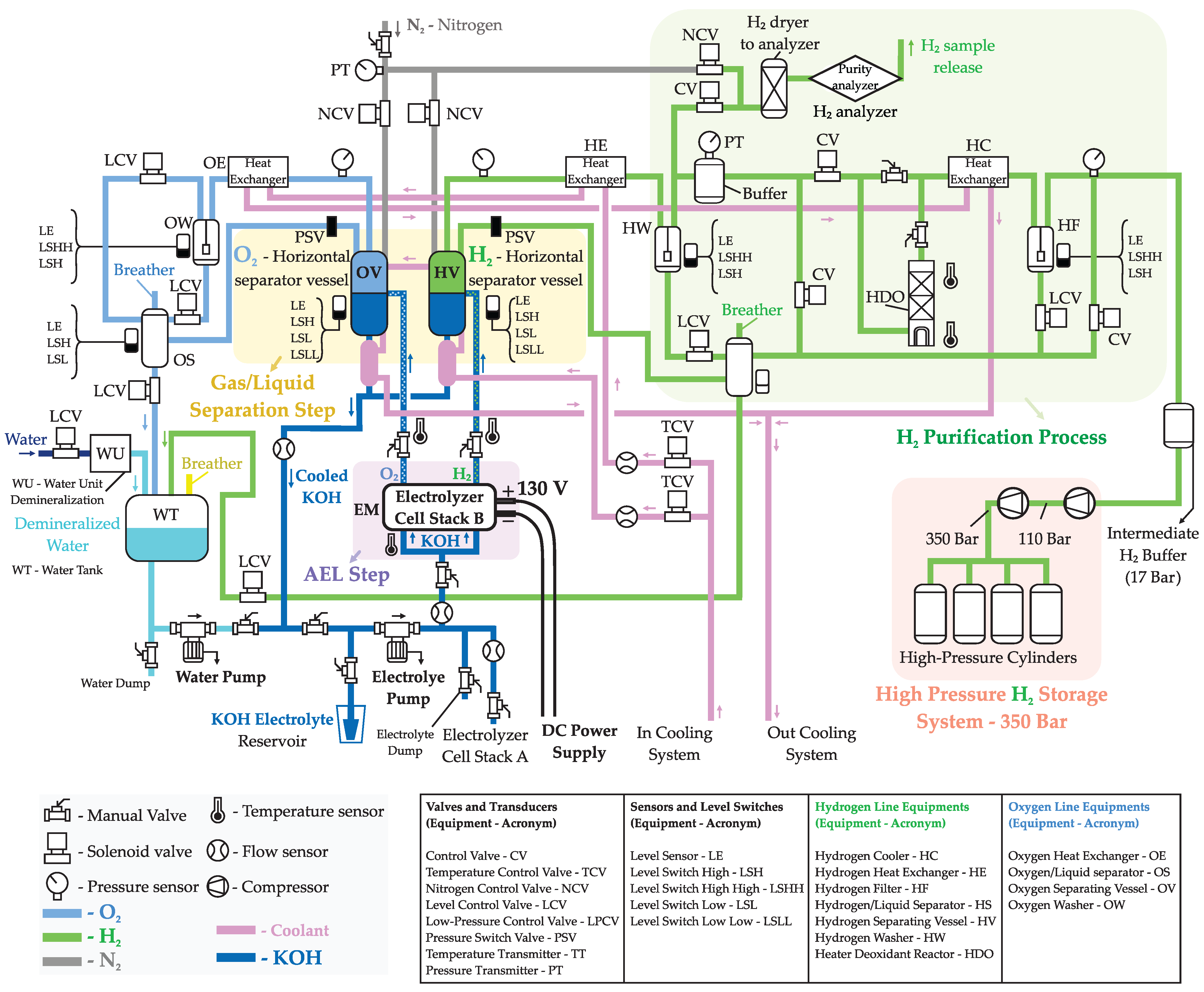10]. This paper experimentally demonstrates that combining different RESs with battery energy storage systems (BESSs) enables the complete and proper management of the electricity provided to an electrolyzer, thereby mitigating the intermittent nature of RESs and increasing system reliability.