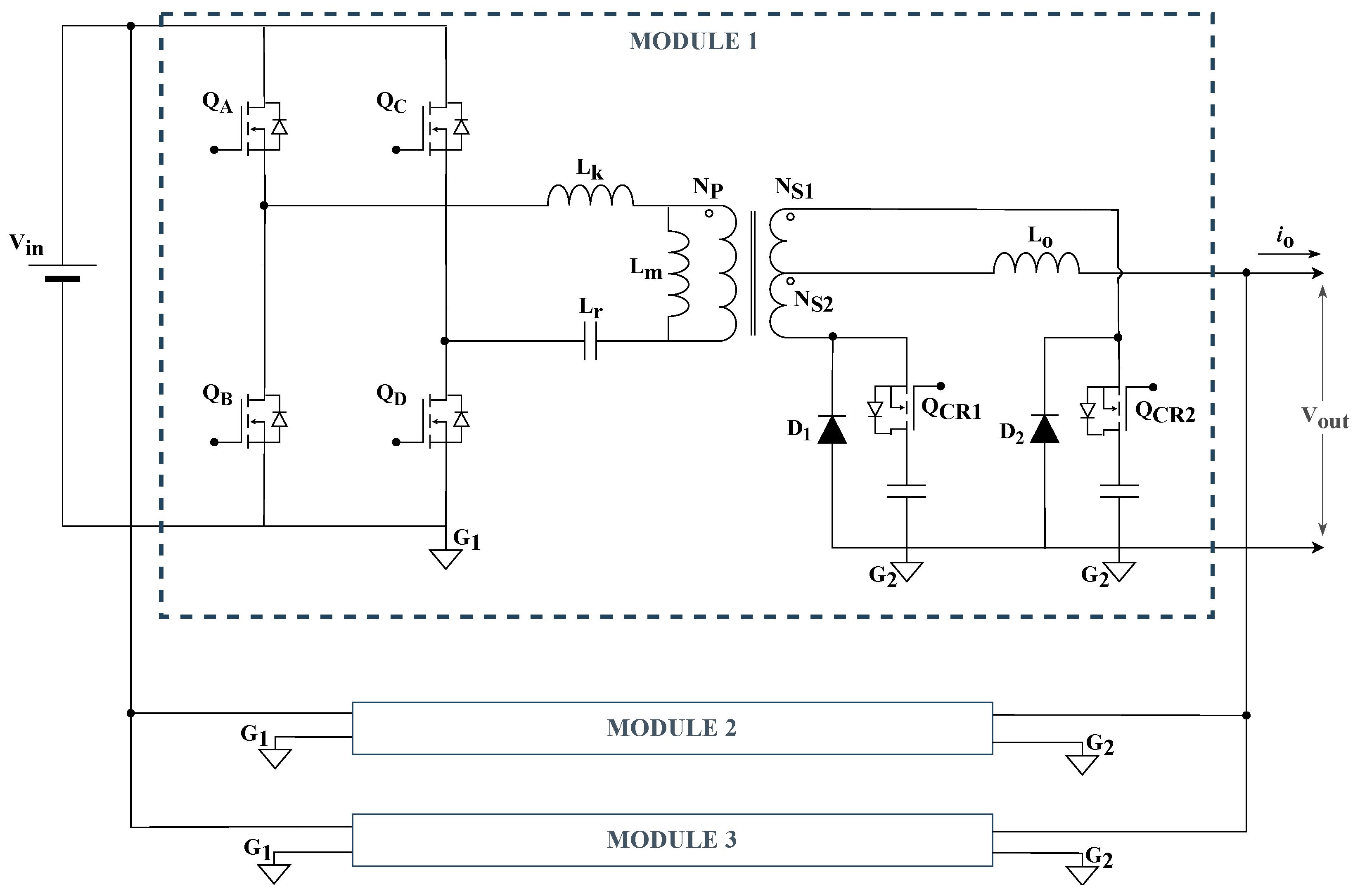 21]. Modularity and current sharing are desirable characteristics that increase reliability and enable scalability to higher power ratings. Finally, a low output current ripple and high conversion efficiency are required to improve overall hydrogen production efficiency [