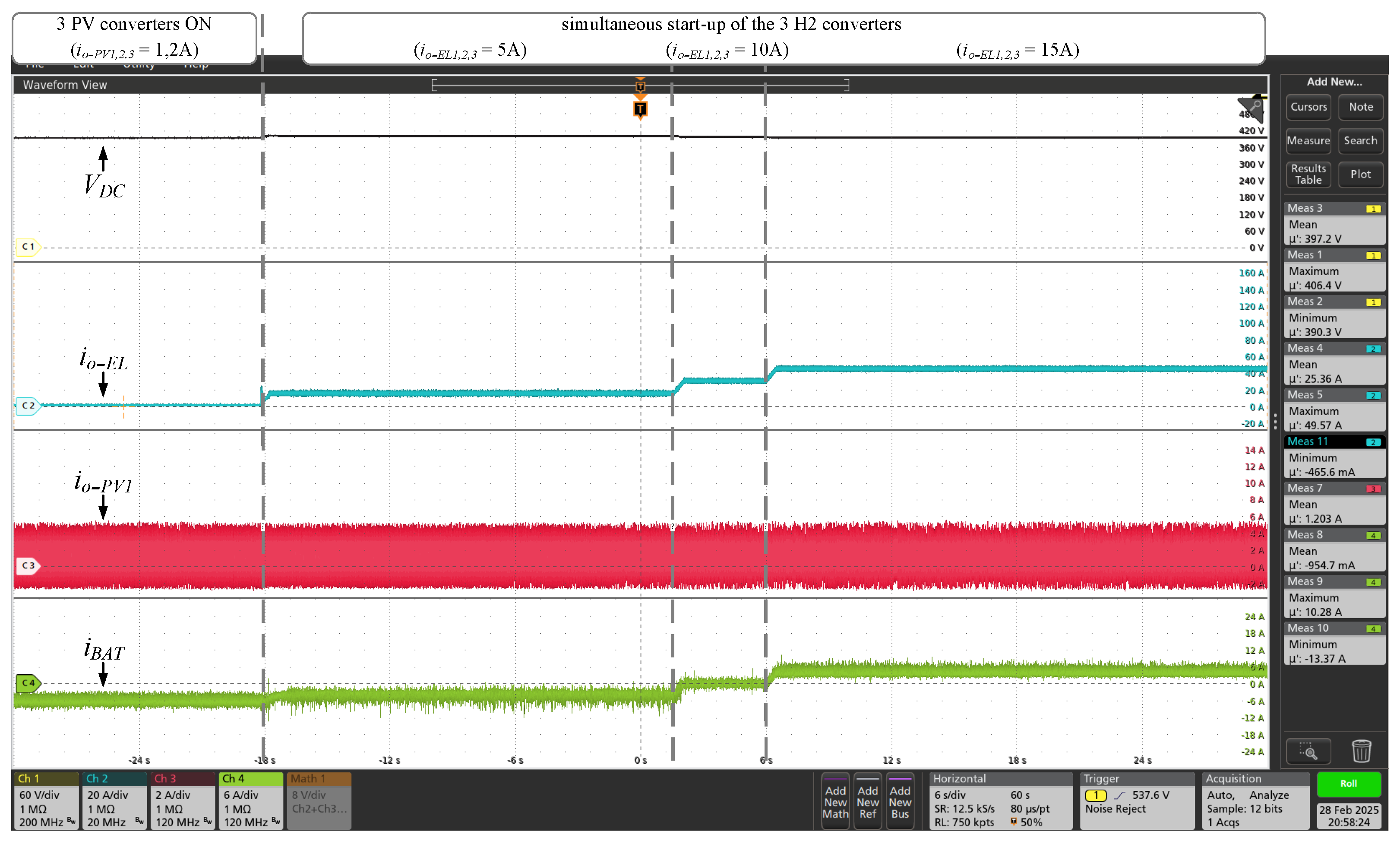 Figure 20. Initially, the electrolyzer was activated with all the required power supplied exclusively by the battery. Subsequently, the solar and wind converters were enabled and began injecting energy into the DC bus. Shortly after their activation, intermittent conditions were introduced, causing successive variations in the power delivered by both sources. The system maintained stable operation throughout these disturbances, with the BESS dynamically compensating for power deficits to ensure an uninterrupted current supply to the electrolyzer. The DC bus voltage remained within nominal levels, as well as the output current of the electrolyzer converters, and no instabilities were observed. These results demonstrate the system’s ability to manage renewable intermittency effectively, ensuring continuous and reliable hydrogen production under fluctuating generation scenarios.